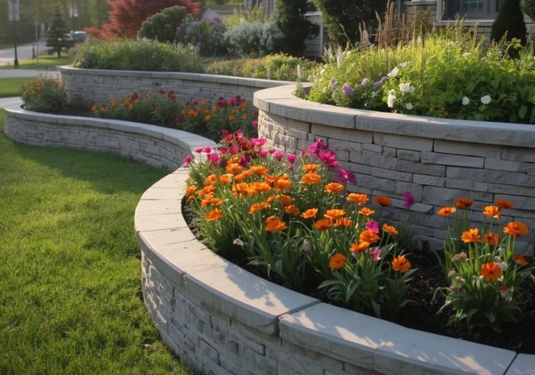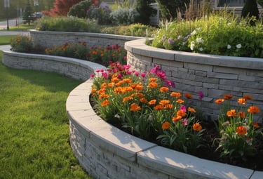 Custom landscaping services including flower beds, retaining walls, fresh mulch, and precise trimming to enhance your property.